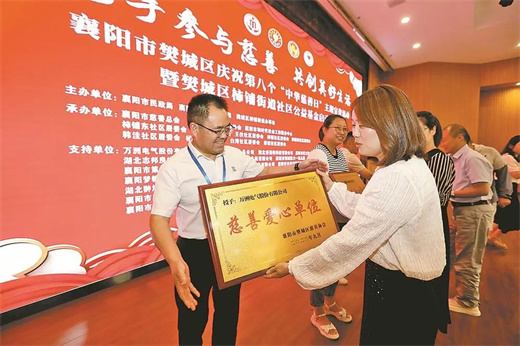 9月5日是我國第八個“中華慈善日”。當日,由樊城區民政局等單位主辦的“攜手參與慈善 共創美好生活”2023年樊城區柿鋪街道“中華慈善日”宣傳活動暨“樊城區柿鋪街道社區公益基金”啟動儀式舉行。活動現場,區民政局向柿鋪街道授予“柿鋪街道·社區公益基金”牌匾,萬洲電氣股份有限公司、湖北諾伯特科技有限公司等公司捐贈1萬元以上的愛心基金。