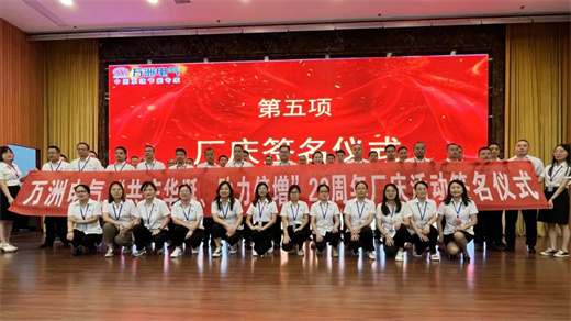重溫萬洲人誓詞、集體獻禮、員工代表發言、簽字儀式,在廠慶活動各環節中,大家熱情高漲,歡聲笑語,掌聲雷動。“我是萬洲人,我保證做到:認同萬洲理念,忠于萬洲事業……”,在萬洲電氣總經理助理、企業發展部經理沈瀟的帶領下,大家重溫萬洲人誓詞,錚錚誓言,響徹四方!接著,萬洲電氣市場、研發、產品和綜合管理四大部門、云川光電、襄陽工廠、萬洲機械組成的七大方陣滿懷激情、斗志昂揚地獻禮萬洲華誕。隨后,在李總、包總、峰總、邦總的帶領下,集團公司全體干部、后備干部、班組長及23名員工代表分別上臺簽名,表達對公司的祝福,簽署對立足崗位、奉獻萬洲的承諾。