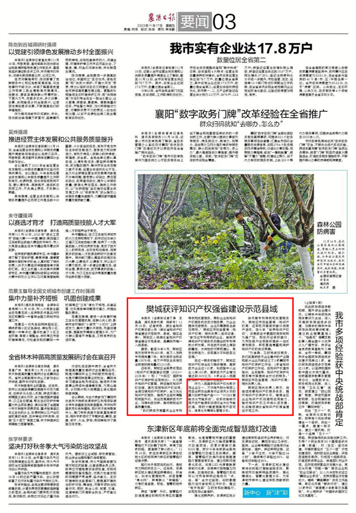 11月15日,記者獲悉,湖北省知識(shí)產(chǎn)權(quán)局日前公布《湖北省知識(shí)產(chǎn)權(quán)強(qiáng)省建設(shè)示范城市、縣域、園區(qū)名單》,樊城區(qū)入選湖北省知識(shí)產(chǎn)權(quán)強(qiáng)省建設(shè)示范縣域,是襄陽市唯一入選縣域。