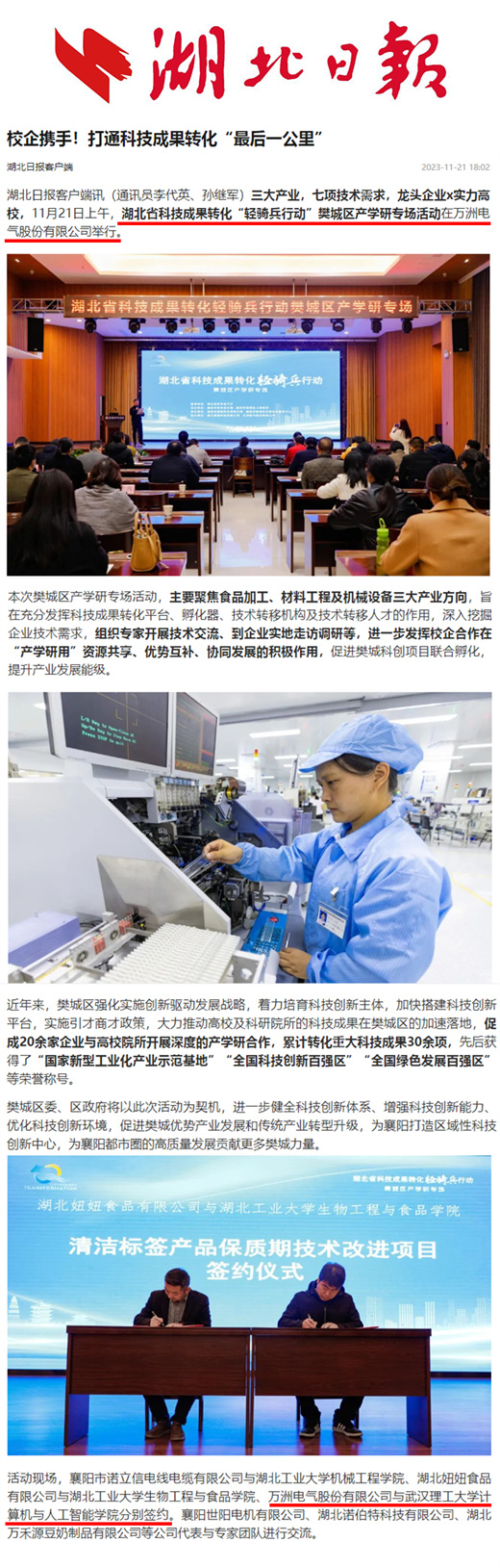 活動(dòng)現(xiàn)場(chǎng),襄陽(yáng)市諾立信電線電纜有限公司與湖北工業(yè)大學(xué)機(jī)械工程學(xué)院、湖北妞妞食品有限公司與湖北工業(yè)大學(xué)生物工程與食品學(xué)院、萬(wàn)洲電氣股份有限公司與武漢理工大學(xué)計(jì)算機(jī)與人工智能學(xué)院分別簽約。襄陽(yáng)世陽(yáng)電機(jī)有限公司、湖北諾伯特科技有限公司、湖北萬(wàn)禾源豆奶制品有限公司等公司代表與專(zhuān)家團(tuán)隊(duì)進(jìn)行交流。
