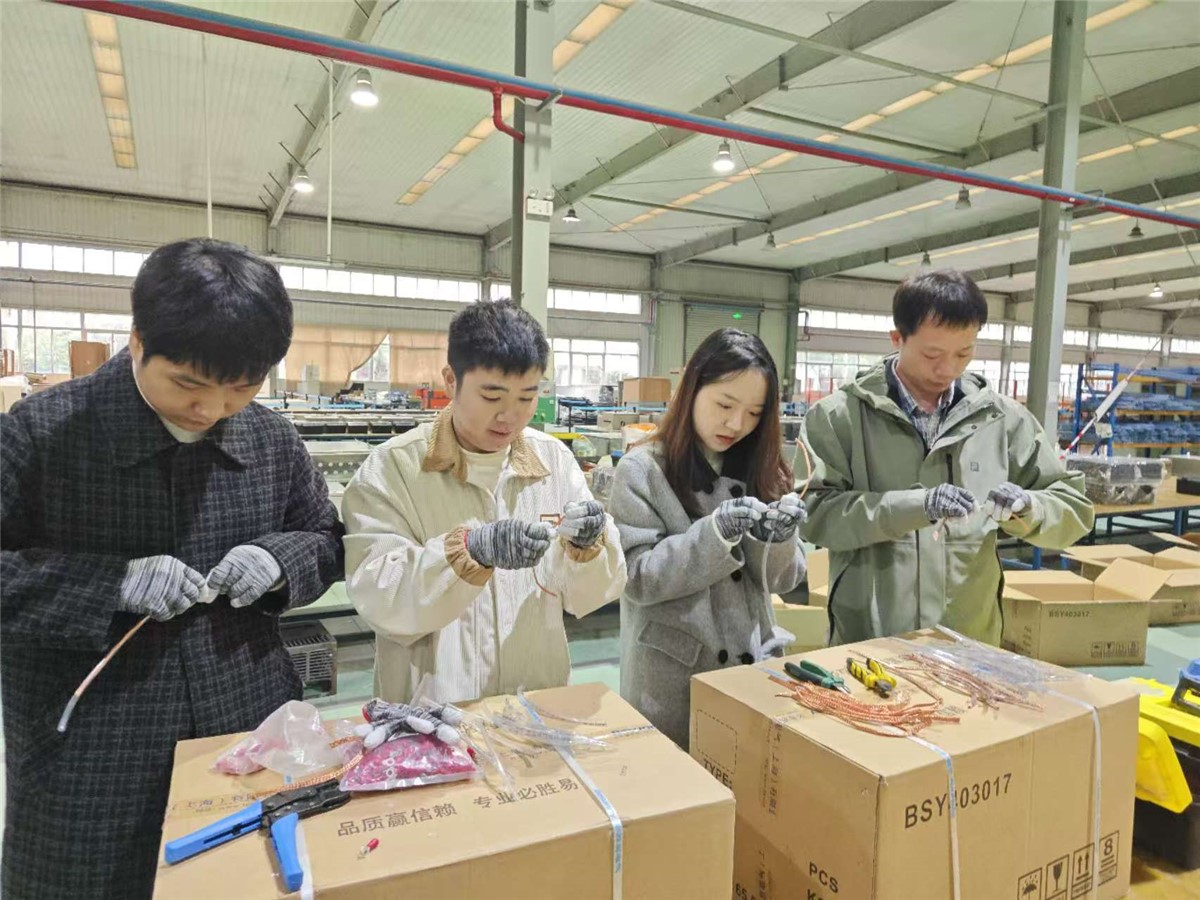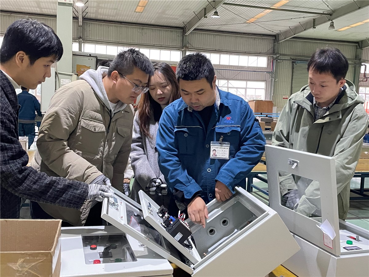 本次實(shí)踐活動(dòng)主要采取“理論+實(shí)操”的形式,青年干部們深入車間,與一線生產(chǎn)工人近距離接觸,學(xué)習(xí)電氣裝配知識(shí),增強(qiáng)動(dòng)手實(shí)踐能力。到崗第一天,萬(wàn)洲電氣生產(chǎn)部經(jīng)理方博詳細(xì)介紹了電氣車間生產(chǎn)環(huán)境,并開(kāi)展了崗前安全教育;新人班班長(zhǎng)講解了生產(chǎn)工具、物料領(lǐng)用、工藝流程等內(nèi)容。青年干部們還參觀了工藝展示臺(tái),橫平豎直、整潔美觀的電氣裝配工藝給大家留下深刻印象。