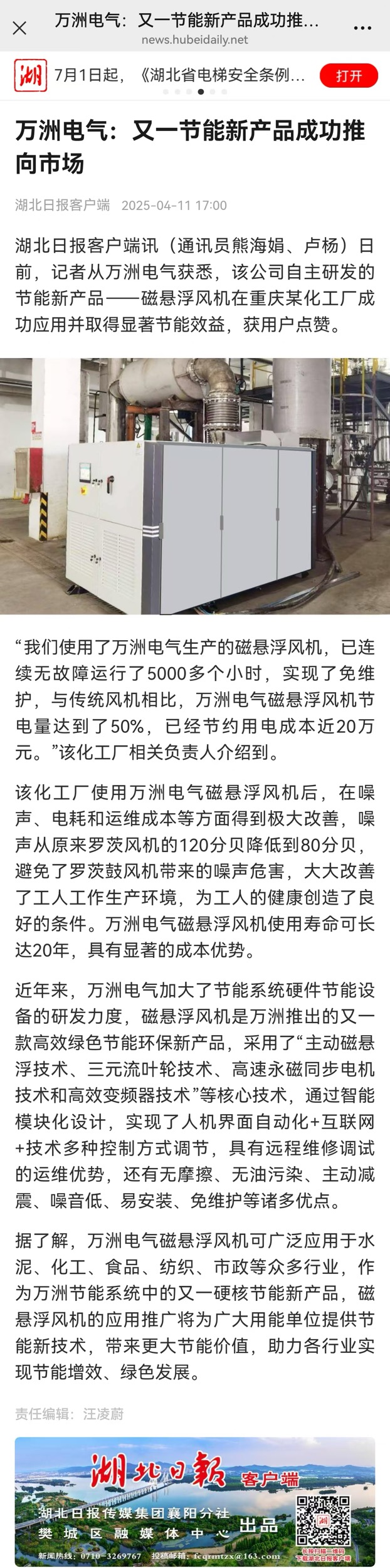 日前,記者從萬洲電氣獲悉,該公司自主研發的節能新產品——磁懸浮風機在重慶某化工廠成功應用并取得顯著節能效益,獲用戶點贊。