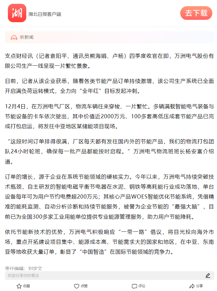 訂單的增長,源于企業在系統節能領域的硬核實力。今年以來,萬洲電氣持續突破技術瓶頸,自主研發的智能電磁平衡節電器在水泥、鋼鐵等高耗能行業成功落地,單臺設備每年可為用戶節約電費超200萬元;其核心產品WOES智能優化節能系統,憑借精準的能耗監測、自動分析診斷和持續節能服務,被譽為企業節能的“最強大腦”,目前已為全國300多家工業用能單位提供專業能源管理服務,助力用戶節能降耗。