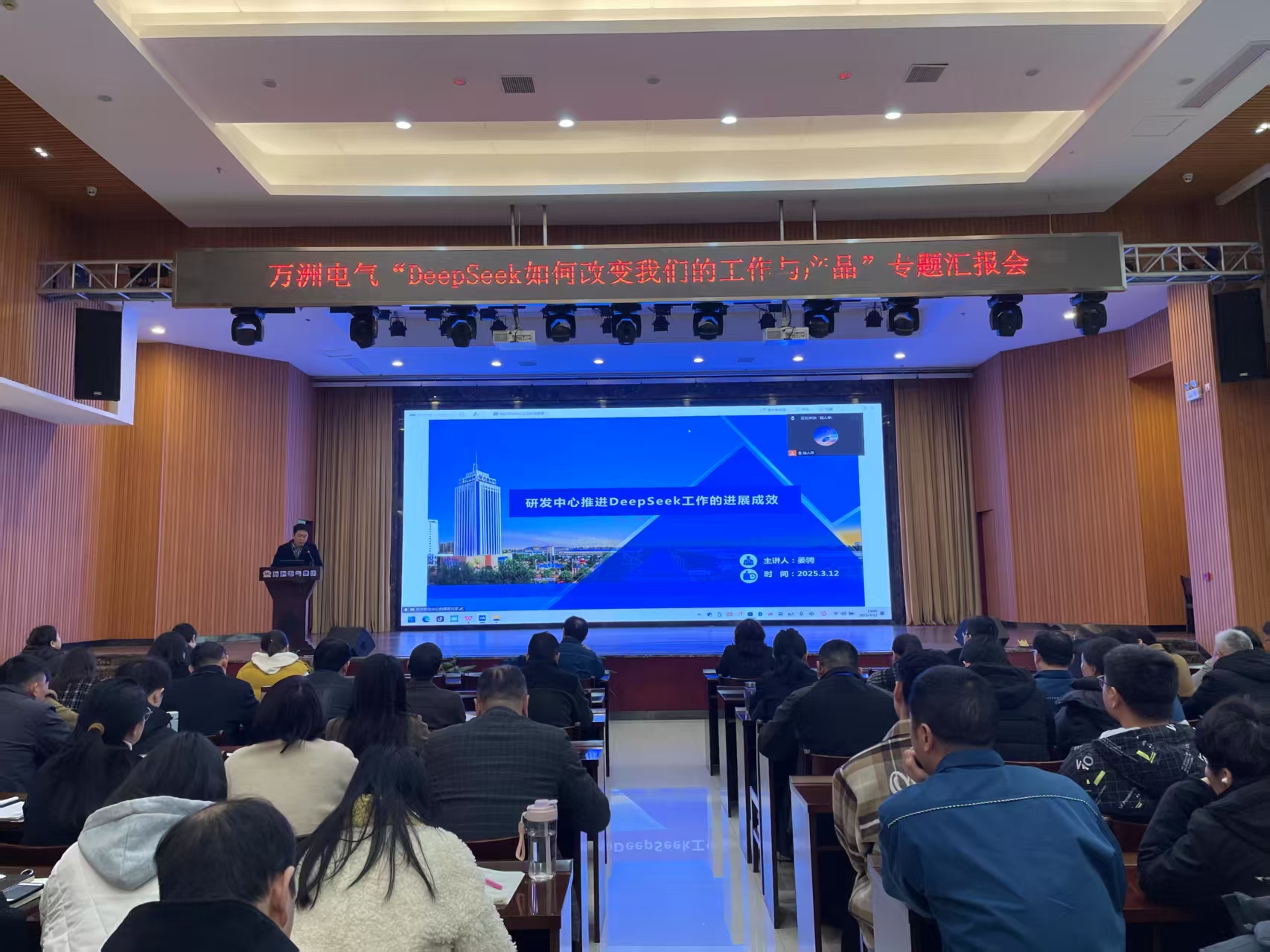 3月12日,萬洲電氣在一樓多功能廳召開deepseek利用成效匯報會,全體后方干部、各部門班組長、骨干及四大督辦部門相關人員共計百余人參加會議,萬洲電氣董事長、總經理趙世運、萬洲電氣副總經理、黨委書記李明輝、萬洲電氣副總經理包群英出席會議。