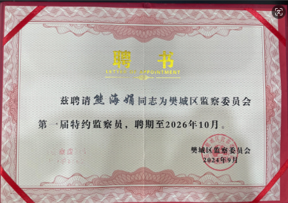 9月11日上午,樊城區監委召開第一屆特約監察員會議,聘請了12名特約監察員。萬洲電氣工會主席、行政部經理熊海娟被聘為樊城區監察委員會第一屆特約監察員,樊城區委常委、區紀委書記、區監委主任周華偉為特約監察員頒發聘書。